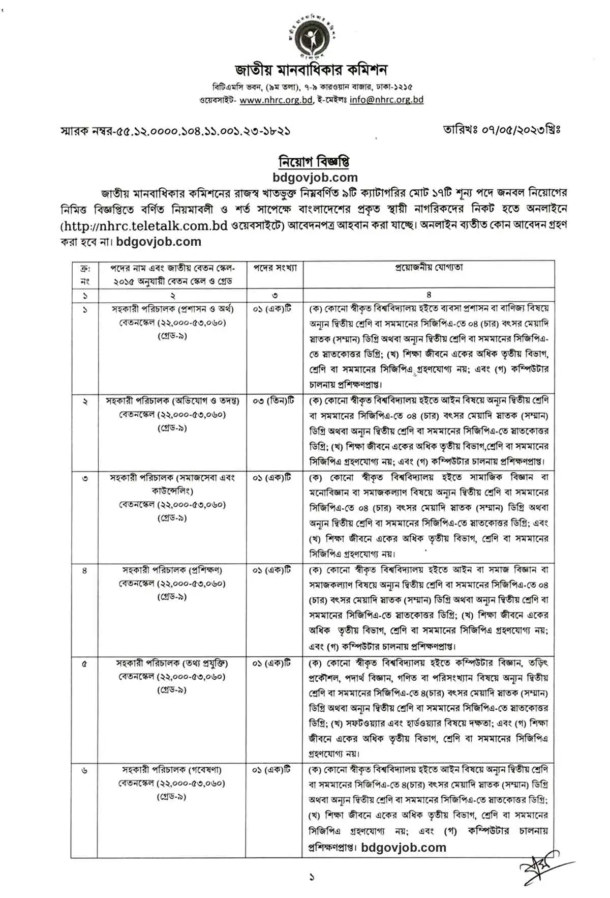 NHRC Job Circular 2023 has been published on 07 May 2023 for interested, eligible, and qualified people. A total of 17 people will be hired for 09 posts through this NHRC circular 2023. The online application will start on 10 May 2023 at 10 AM and will end on 30 May 2023 at 5 PM. Eligible interested candidates can submit their NHRC Job application form on the NHRC teletalk com bd website http://nhrc.teletalk.com.bd.
